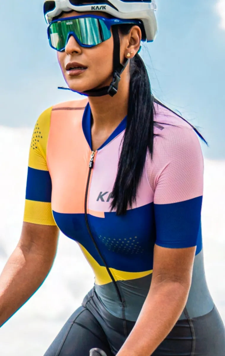 - Laser-cut sleeves + front band for aero advantage